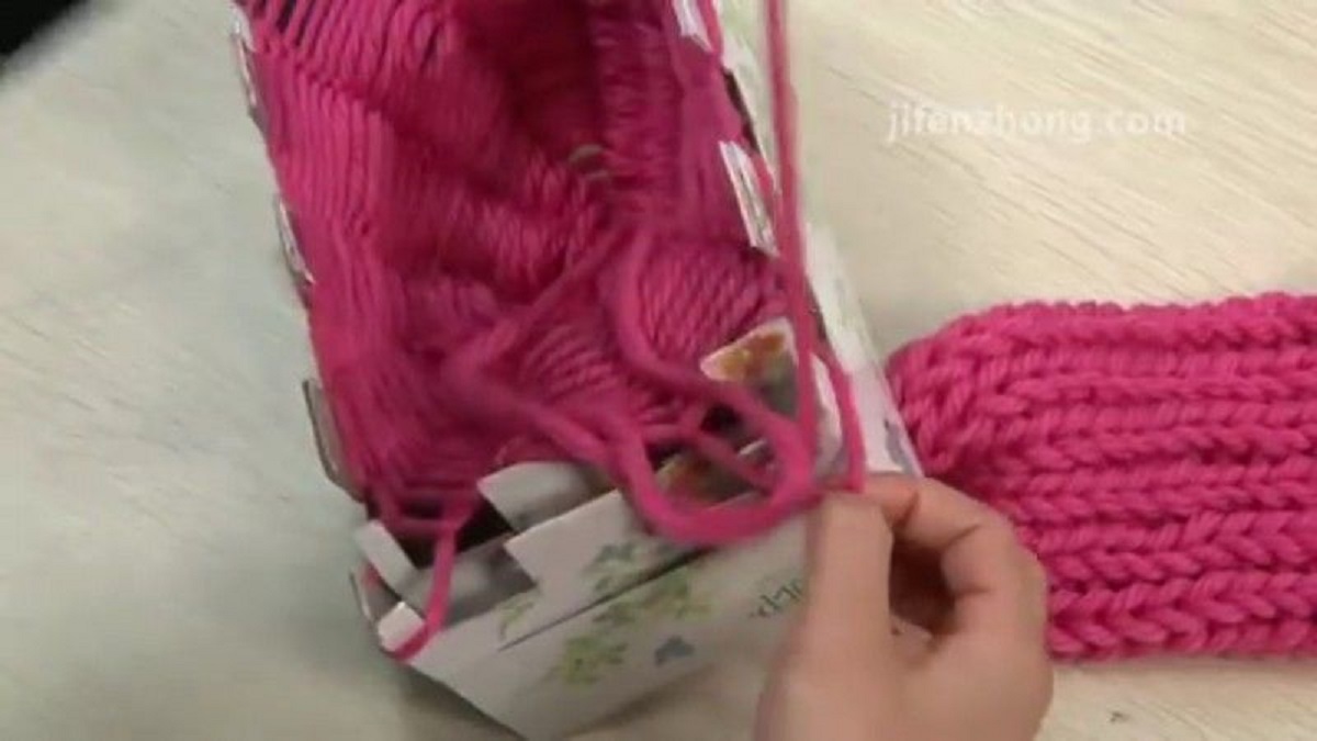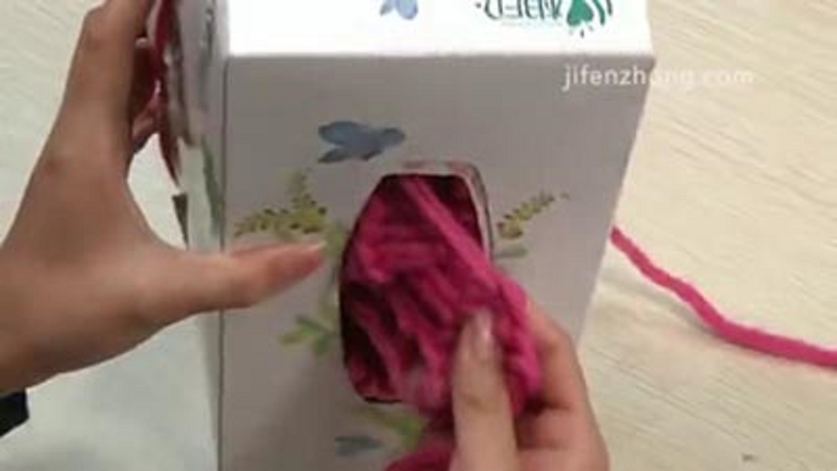 عندما تحصلون على الطول المناسب، قوموا بعقده لتنهوا عملكم وتجنبوا أن ينسل الوشاح . لكن لا تقطعوا كذلك ما بقي من الخيط ! ثم اسحبوا الوشاح من خلال الفتحة في أسفل العلبة.