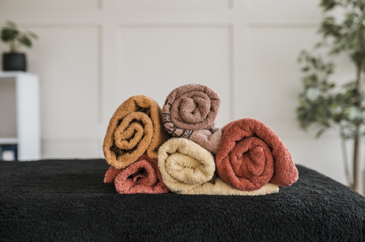 1. لفّوا الجهتين المتقابلتين من المنشفة حتى وسطها.